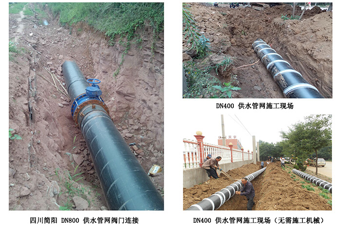 在工程施工方面,大口径膜片管也占很大优势。钢丝缠绕超高膜片管的比重约为1.2,而由于其壁厚很薄,直径可以小一号,其重量比铸铁管和PCCP管小5—10倍,搬运和安装非常轻便。超高膜片复合管的柔韧性很好,可以先在地面上连接好之后再下到管沟里,边挖沟边下管,边填埋。不用修路,不用大型机械,不用地基处理。铸铁管和PCCP管必须挖很宽的沟,管道下到沟里对正连接,受到很大局限,工程费用大幅上涨。在需要穿越江河的情况,新利(中国)膜片管可用沉入法在江河底敷设,也可用拖拉法从江底隧道或管道中拖曳而过,这都是铸铁管和PCCP管做不到的。